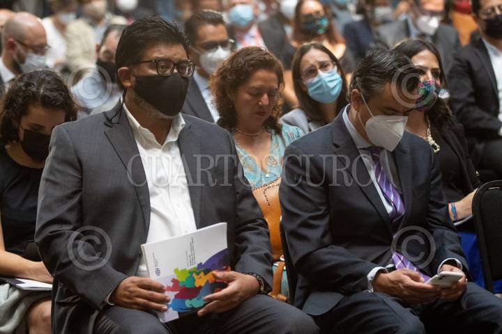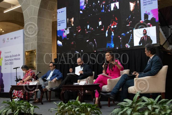 Clemente Castañeda, Beatriz Paredes, Alejandro Ponce, Alejandro González Arreola, Kenia López Rabadán, y Emilio Álvarez Icaza, durante la presentación del Índice de Estado de Derechos en México 2021-2022.