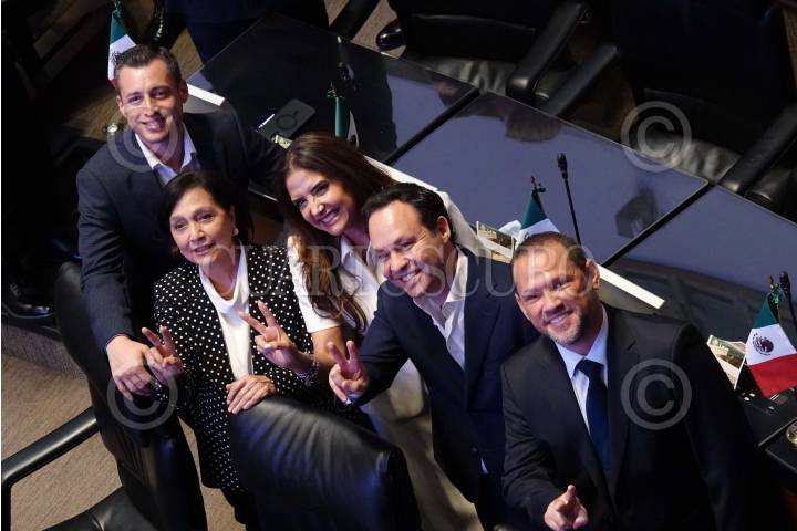 CIUDAD DE MÉXICO, 29AGOSTO2024.- Luis Donaldo Colosio Riojas, Amalia García, Alejandra Barrales, Clemente Castañeda y Francisco Daniel Barreda, senadores electos por Movimiento Ciudadano, se tomaron una foto durante la Sesión Constitutiva del Senado de la República. FOTO: GRACIELA LÓPEZ /CUARTOSCURO.COM