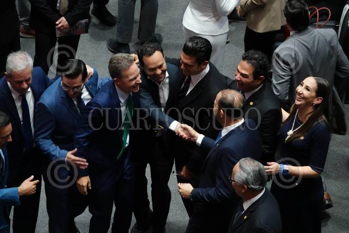 CIUDAD DE MÉXICO, 01SEPTIEMBRE2024.- Manuel Velasco, coordinador del PVEM en le Senado, Clemente Castañeda, coordinador de Movimiento Ciudadano (MC) en Diputados, saludan a Marko Cortés y a Jorge Romero, que encabezan al partido Acción Nacional, previo a la sesión en que fue entregado el 6to Informe de gobierno del presidente Andrés Manuel López Obrador, así como la instalación de la LXVI Legislatura. FOTO: GALO CAÑAS/CUARTOSCURO.COM