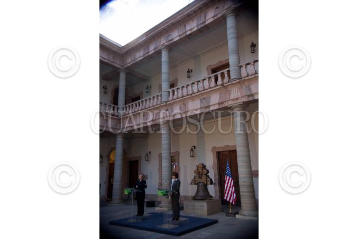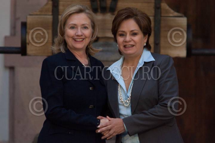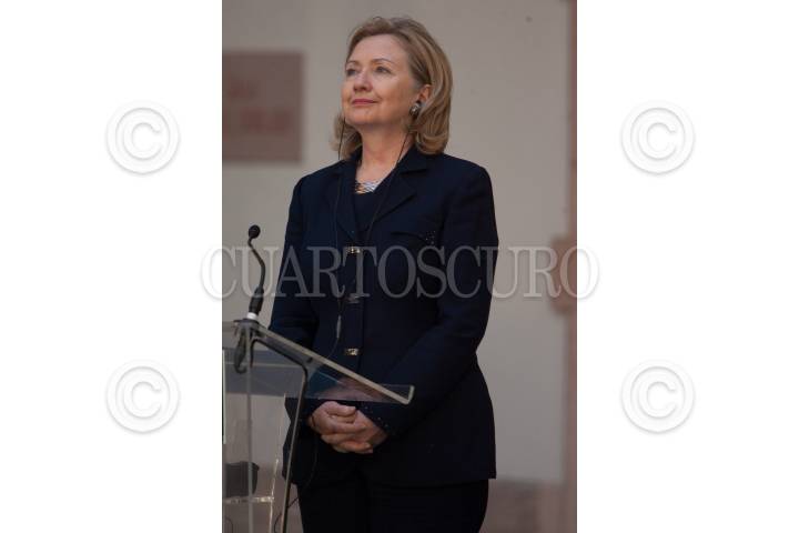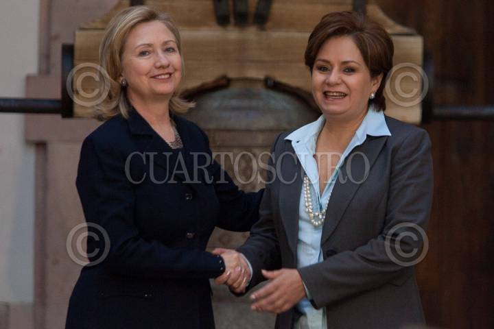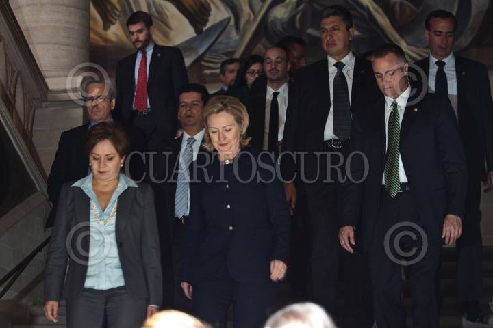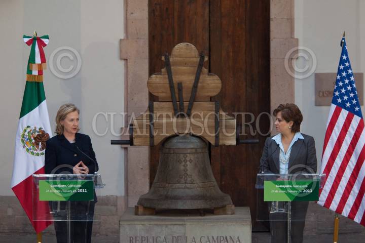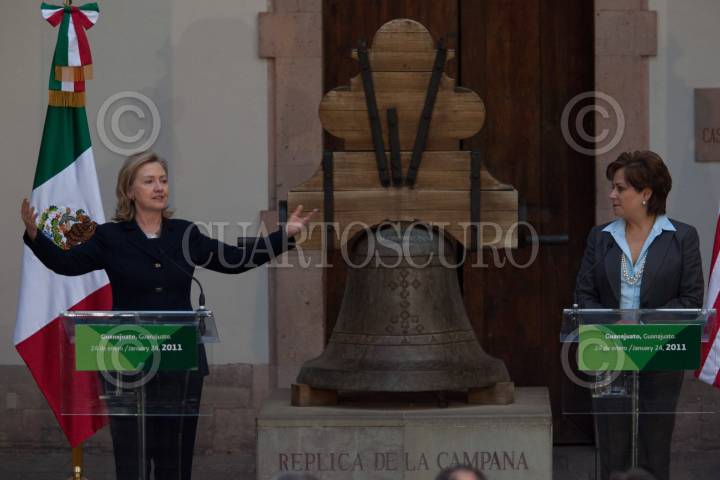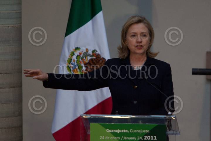 GUANAJUATO,GUANJUATO, 24ENERO2011.- Hillary Clinton secretaria de Estado de EE.UU. y Patricia Espinosa canciller mexicana se reunieron en privado en la Alondiga de Granaditas, donde trataron temas relacionados con el crimen organizado, la cooperación bilateral, cambio climático, entre otros. Posteriormente se reunieron con la prensa acreditada donde Clinton hizo elogios al trabajo de México en el combate al narcotráfico y se reusó a hablar sobre las filtraciones de Wikileaks. FOTO: DEMIAN CHÁVEZ/CUARTOSCURO.COM