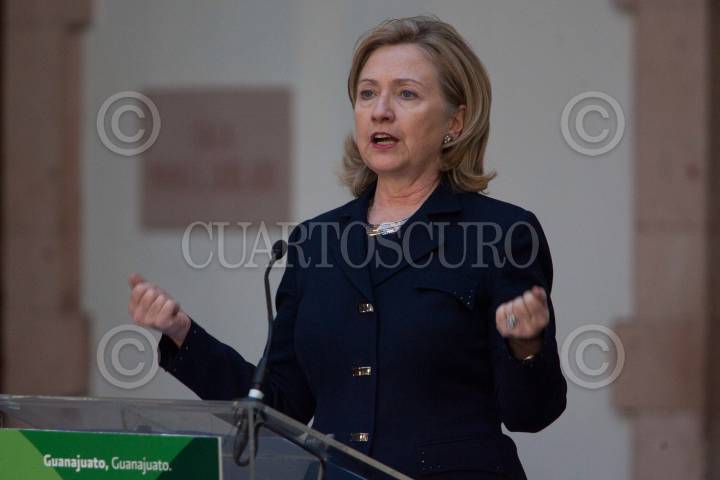 GUANAJUATO,GUANJUATO, 24ENERO2011.- Hilary Clinton secretaria de Estado de EE.UU. y Patricia Espinosa canciller mexicana se reunieron en privado en la Aloniga de Granaditas, donde trataron temas relacionados con el crimen organizado, la cooperación bilateral, cambio climático, entre otros. Posteriormente se reunieron con la prensa acreditada donde Clinton hizo elogios al trabajo de Méxcio en el combate al narcotráfico y se reusó a hablar sobre las filtraciones de Wikyleaks. FOTO: DEMIAN CHÁVEZ/CUARTOSCURO.COM