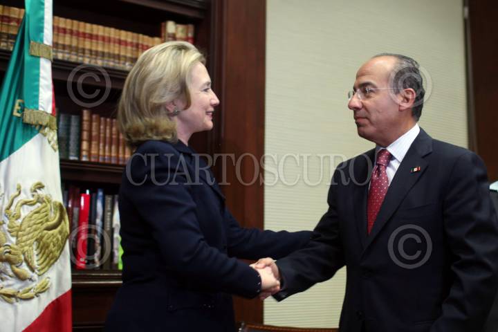 MÉXICO, D.F., 24ENERO2011.- Hillary Clinton, secretaria de Estado de Estados Unidos de Norteamerica y Felipe Calderón Hinojosa, presidente de México, se saludan durante una reunión en la Residencia Oficial de Los Pinos. FOTO: ALFREDO GUERRERO/CUARTOSCURO.COM