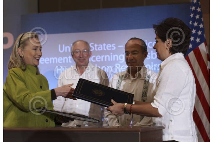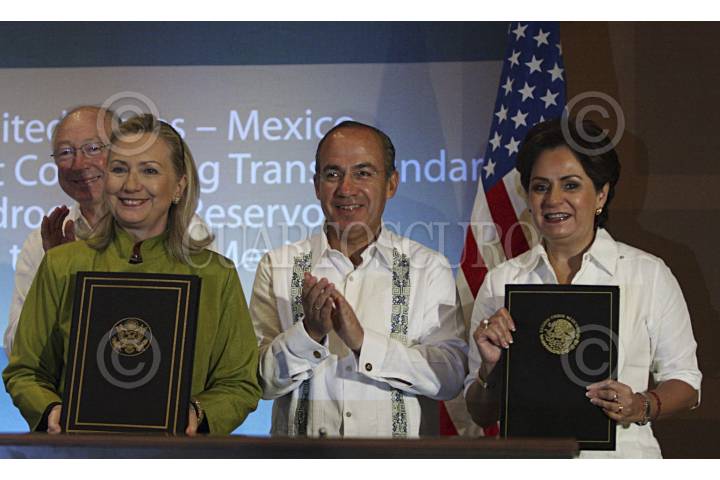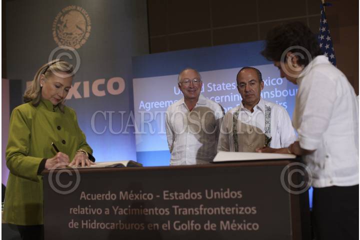 MÉXICO, D.F., 20FEBRERO2012.- Felipe Calderón Hinojosa, acompañado de Hillary Clinton, secretaria de Estado de los Estados Unidos y Patricia Espinosa, Secretaria de Relaciones Exteriores de México durante la firma del acuerdo México-Estados Unidos, relativo a yacimientos transfronterizos de hidrocarburos en el Golfo de México. FOTO: ALFREDO GUERRERO/CUARTOSCURO.COM