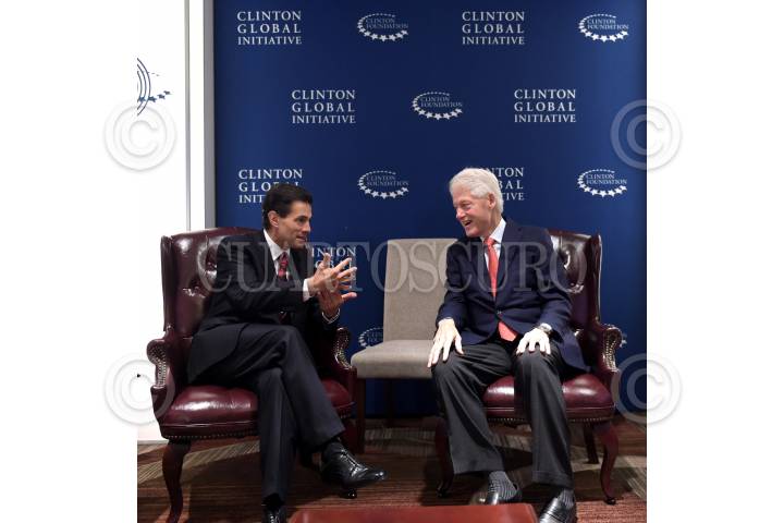 NUEVA YORK, E.U.A., 28SEPTIEMBRE2015.-Como parte de sus actividades en la ONU, el Presidente Enrique Peña Nieto se reunió hoy con el ex Mandatario de Estados Unidos, Bill Clinton, quien encabeza aquí la Reunión Anual de la Clinton Global Iniciative 2015. En el encuentro les acompañaron la Secretaria de Relaciones Exteriores, Claudia Ruiz Massieu; el Embajador de México en este país, Miguel Basáñez, y el Jefe de la Oficina de la Presidencia, Francisco Guzmán Ortiz, entre otros funcionarios. FOTO: PRESIDENCIA /CUARTOSCURO.COM