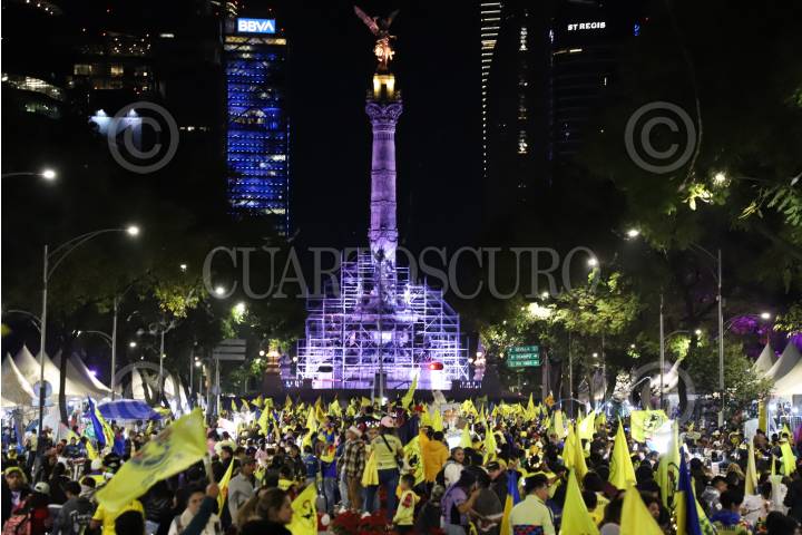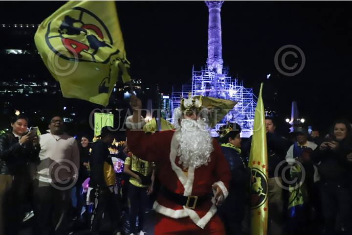CIUDAD DE MÉXICO, 15DICIEMBRE2024.- Cientos de aficionados del América se reunieron en el Ángel de la Independencia para celebrar el tricampeonato de la institución que consiguieron está noche cuando derrotaron a Monterrey. FOTO: DANIEL AUGUSTO/ CUARTOSCURO.COM