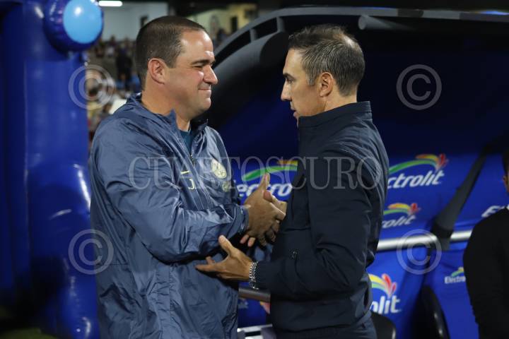 CIUDAD DE MÉXICO, 15MAYO2025.- Los técnicos de América y Cruz Azul, André Jardine y Vicente Sánchez, se saludan antes del inicio del encuentro. FOTO: DANIEL AUGUSTO/CUARTOSCURO.COM