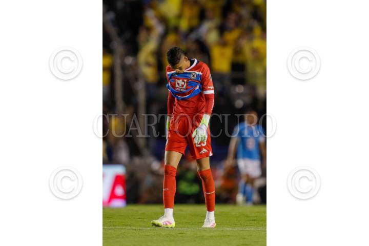 CIUDAD DE MÉXICO, 18MAYO2025.- Kevin Mier, arquero de la Máquina, se lamenta su error durante el encuentro. El Cruz Azul cayó 2-1 ante el América, en el partido se ida de la semifinal de la Liga MX, quedando 2-2 en el global, por que los de Coapa avanzan a la final por tener mejor posición en la tabla general. Las anotaciones fueron por parte de las Águilas de Henry Martín y Cristian Alexis Borja, mientras que de los celestes se hizo presente Lorenzo Faravelli. Partido disputado en el Estadio Ciudad de los Deportes. FOTO: CUARTOSCURO.COM