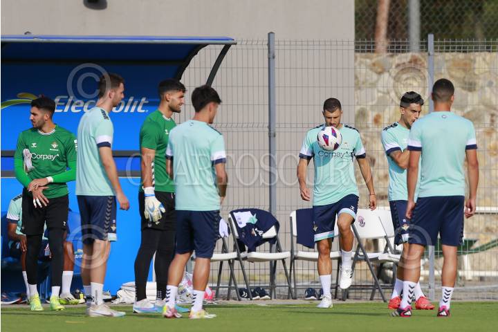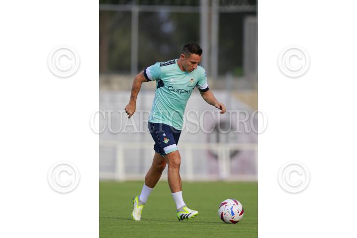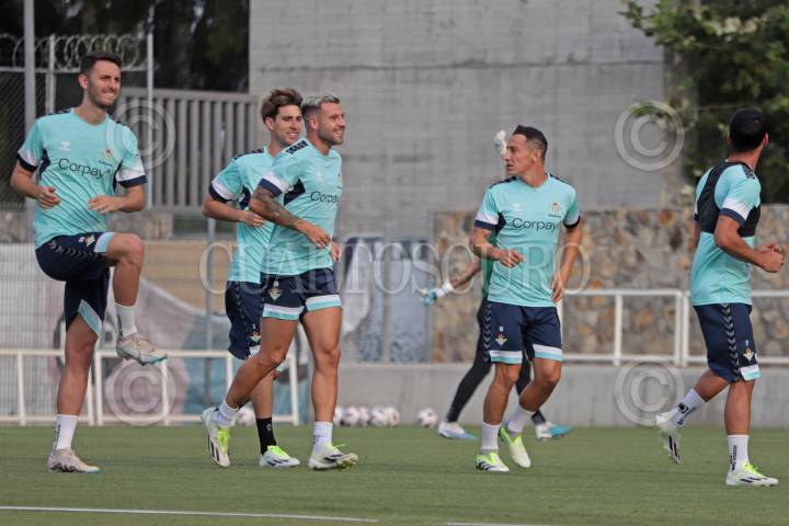 Jugadores del equipo español Real Betis participan en una sesión de entrenamiento, hoy previo a su partido ante el Sevilla como parte del tour de La Liga Española a disputarse en la ciudad de Guadalajara, Jalisco.