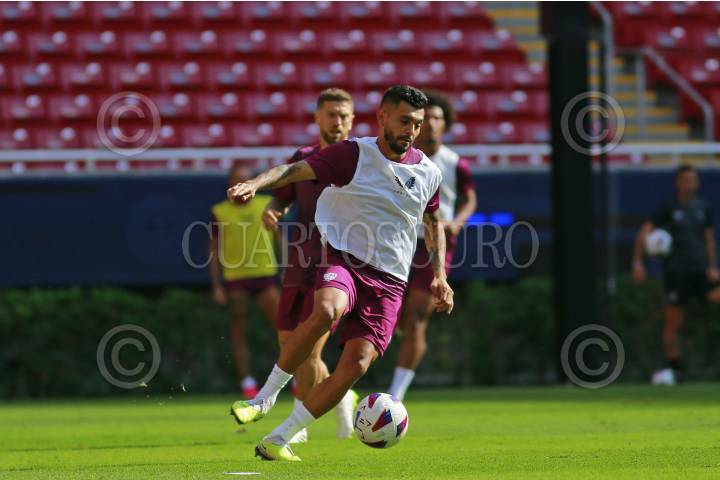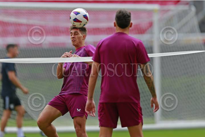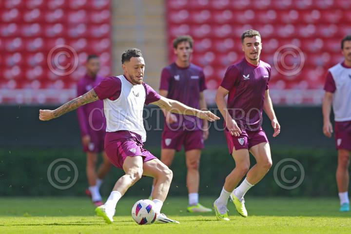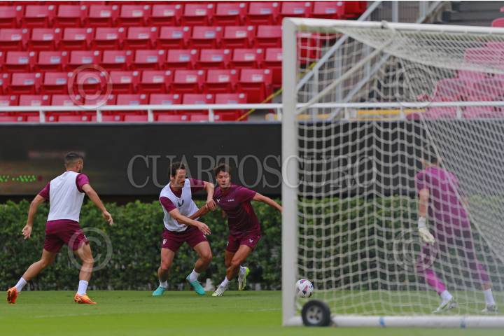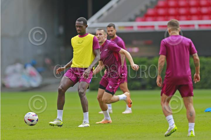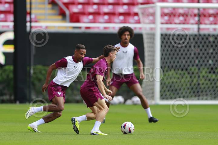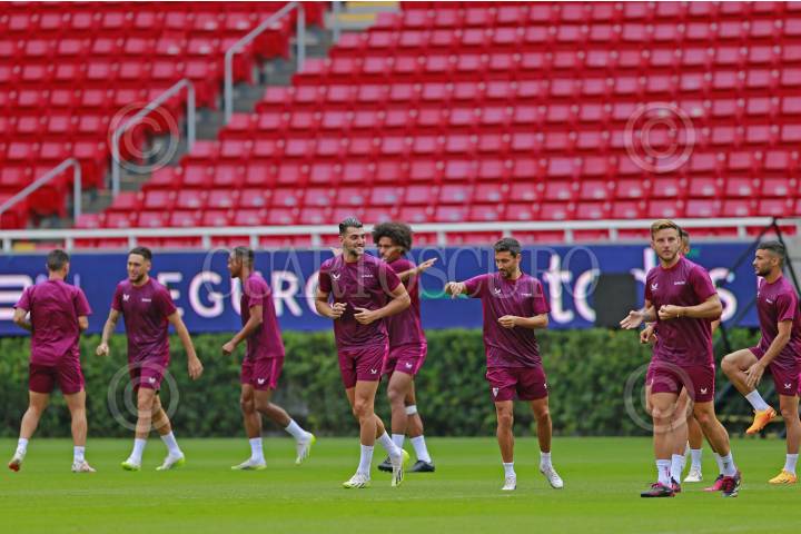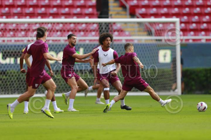 Jugadores del equipo español Sevilla participan en una sesión de entrenamiento, hoy previo a su partido ante el Real Betis, esto como parte del tour de La Liga a disputarse en el Estadio Akron.
