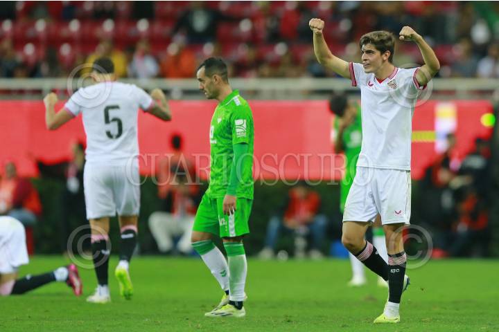 Jugadores del Sevilla, celebran la victoria, esto durante el encuentro que sostienen en el estadio Akron, esto como parte de “LaLiga Summer Tour 2023”, que se lleva a cabo en la ciudad de Guadalajara.