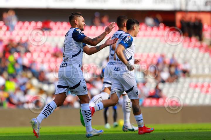 QUERÉTARO, QUERÉTARO, 16FEBRERO2025.- Germán Berterame del Monterrey en festejo de gol durante el partido de la jornada 7 del Torneo Clausura 2025 de la Liga BBVA MX en el Estadio Corregidora. Los Gallos Blancos cayeron 4-2 ante los regios. FOTO: CÉSAR GÓMEZ/CUARTOSCURO.COM