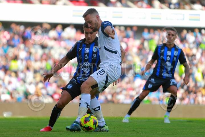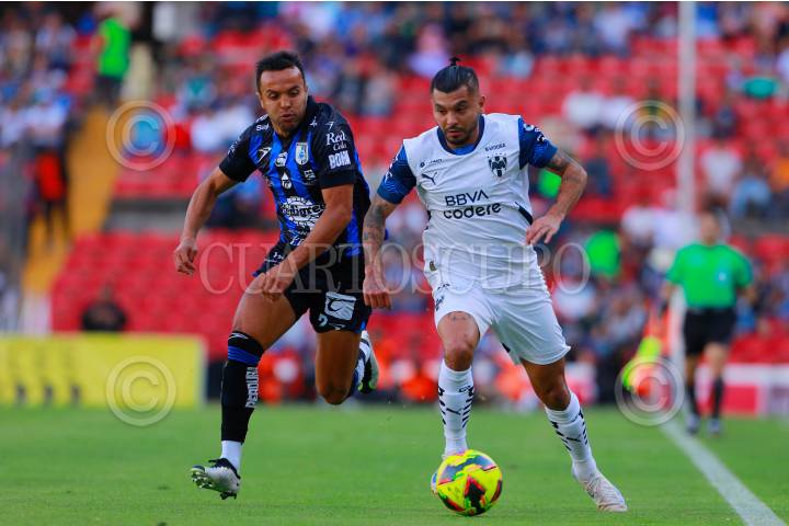 QUERÉTARO, QUERÉTARO, 16FEBRERO2025.- Kevin Escamilla del Querétaro y Sergio Canales del Monterrey durante el partido de la jornada 7 del Torneo Clausura 2025 de la Liga BBVA MX en el Estadio Corregidora. Los Gallos Blancos cayeron 4-2 ante los regios. FOTO: CÉSAR GÓMEZ/CUARTOSCURO.COM