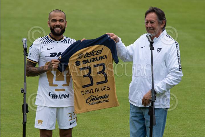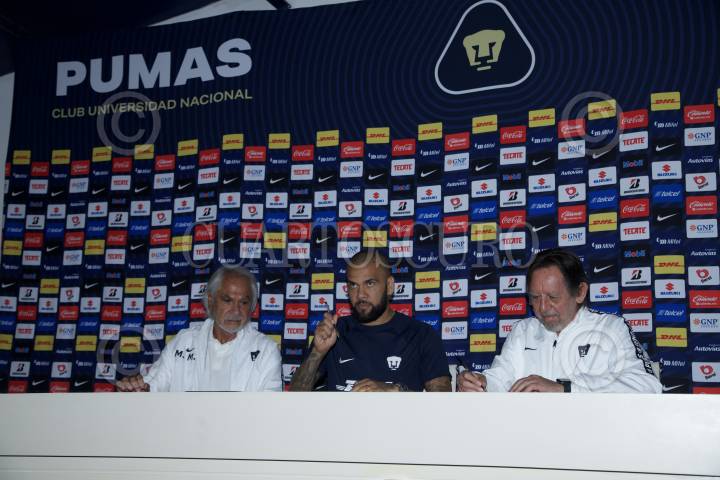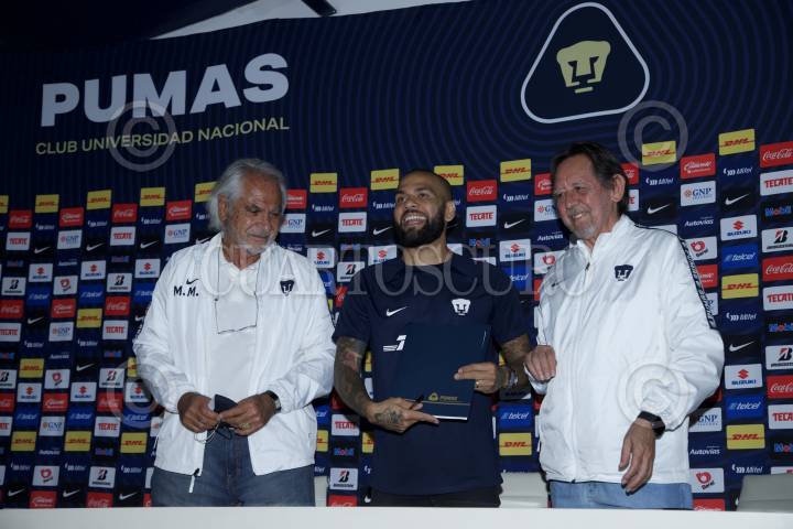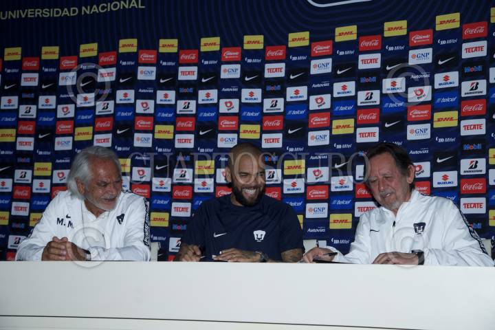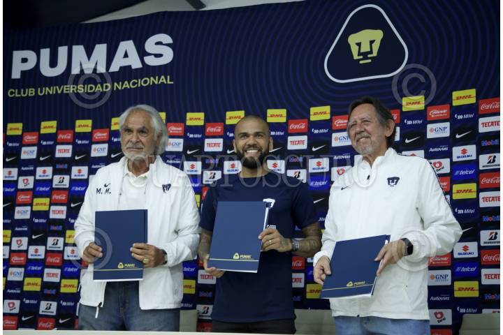 El jugador Dani Alves y el presidente del Club Universidad Nacional, el ingeniero Leopoldo Silva junto con Miguel Mejía Barón hacen oficial la contratación del defensa brasileño proveniente del Club Barcelona con la firma del contrato por un año y uno más opcional defendiendo la playera de Pumas.