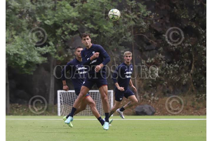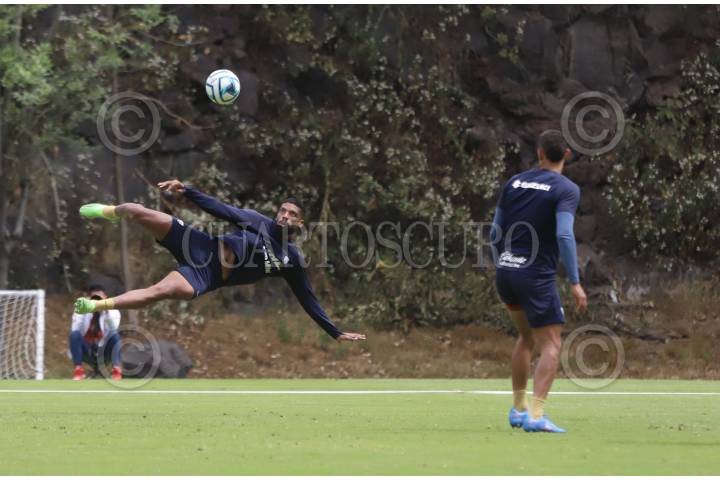 Juan Dinenno remata un balón durante el entrenamiento de Pumas, Club Universidad Nacional en las instalaciones de La Cantera.