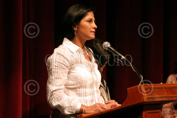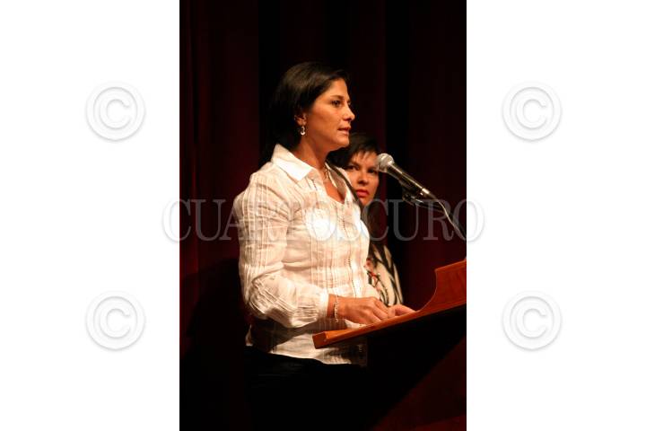 MÉXICO, D.F., 03ABRIL2007.- Miriam Cacho, hermana de la escritora Lydia Cacho, recibió el premio Coatlicue en nombre de la autora de Los Demonios del Edén, en el Teatro de la Ciudad. FOTO: MOISÉS PABLO/CUARTOSCURO.COM