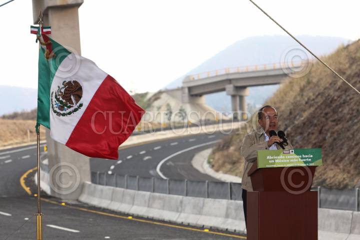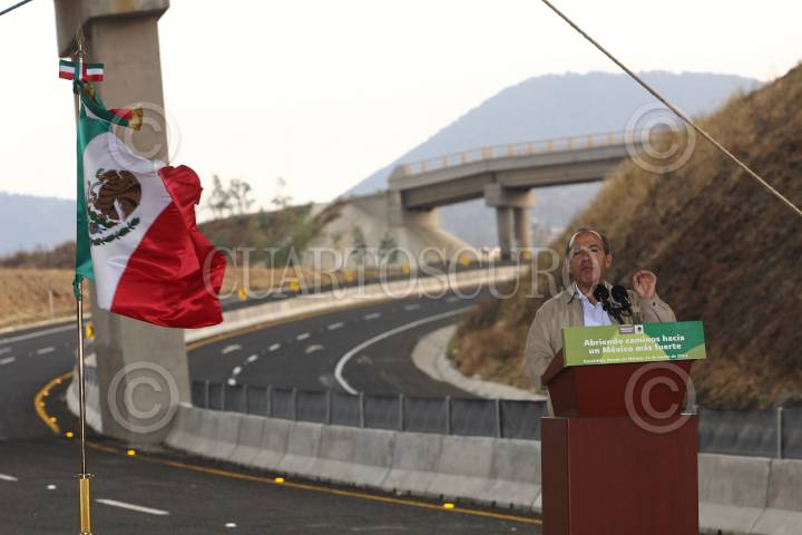 COCOTITLAN, ESTADO DE MÉXICO, 31MARZO2011.- Felipe Calderón Hinojosa, presidente de México, en compañía de Enrique Peña Nieto, gobernador del Estado de México, Marco Antonio Adame, gobernador de Morelos y Josue Castillo, presidente municipal de Cocotitlan, inauguraron los puentes y la ampliación de la carretera Chalco-Tlalmanalco, misma que beneficiara a automovilistas que viajen de la Ciudad de México a Morelos. FOTO: SAÚL LÓPEZ/CUARTOSCURO.COM