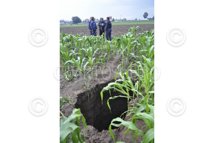 COCOTITLAN, ESTADO DE MÉXICO., 26JUNIO2015.- Personal de protección civil acudieron al paraje el mirador después de la denuncia de ejidatarios ante la presencia de grandes grietas en campos de cultivo y el hundimiento de una gran extensión de terreno. FOTO: CUARTOSCURO.COM