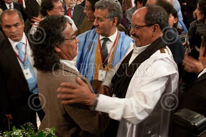 MÉXICO, D.F., 13SEPTIEMBRE2010.- Pedro Valtierra, director de la Revista y Agencia Cuartoscuro, saluda a Mohamed Abdelaziz, presidente de la República Árabe Saharaui Democrática, en el club de periodistas durante el cóctel que ofreció la embajada de La República Árabe Saharaui con motivo de la visita de su presidente. FOTO: IVAN STEPHENS/CUARTOSCURO.COM