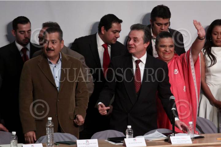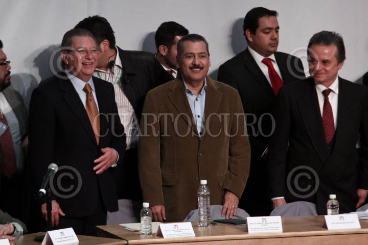 MÉXICO, D.F, 08ENERO2011.- El diputado Francisco Rojas y los senadores Manlio Fabio Beltrones y Pedro Joaquin Codwell durante la entrega de la constancia de mayoria a Humberto Moreira, gobernador con licencia de Coahuila y la diputada federal Cristina Díaz luego de que la Comisión Nacional de Procesos Internos declaró como válida y legítima su candidatura a la dirigencia nacional del Comité Ejecutivo Nacional del Partido Revolucionario Institucional (PRI). FOTO: RODOLFO ANGULO/CUARTOSCURO.COM