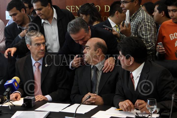 MÉXICO, D.F., 05AGOSTO2011.- Los senadores, José Gonzalez Morfin, Pedro Joaquin Codwell, Jesús Murillo Karam y Tomas Torres durante una conferencia de prensa al termino de una reunión en donde hablaron sobre el proceso de dictaminación de la Ley de Seguridad Nacional que se realizo en instalaciones del Senado de la República. FOTO: RODOLFO ANGULO/CUARTOSCURO.COM