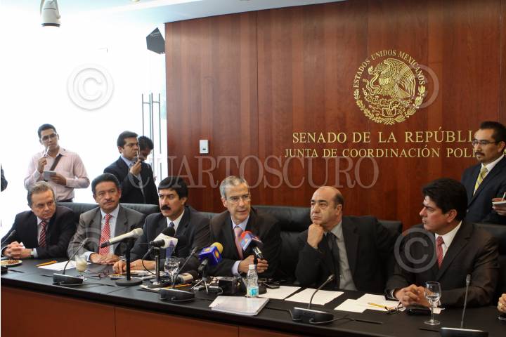 MÉXICO, D.F., 05AGOSTO2011.- Los senadores, Pedro Joaquin Codwell, Carlos Navarrete; el diputado Javier Corral, los senadores José Gonzalez Morfin, Jesús Murillo Karam y Tomas Torres durante una conferencia de prensa al termino de una reunión en donde hablaron sobre el proceso de dictaminación de la Ley de Seguridad Nacional que se realizo en instalaciones del Senado de la República. FOTO: RODOLFO ANGULO/CUARTOSCURO.COM