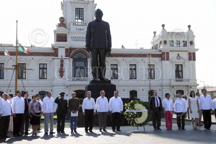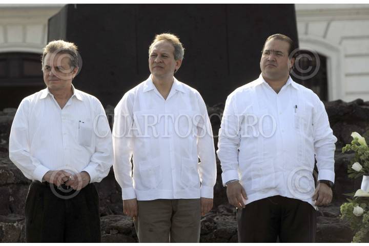 VERACRUZ, VERACRUZ, 06ENERO2012.- El Presidente del Comite Ejecutivo Nacional del PRI, Pedro Joaquín Codwell, el líder de la Confederación Nacional Campesina, Gerardo Sánchez García, y el Gobernador de Veracruz, Javier Duarte de Ochoa asistieron al 97 aniversario de la promulgación de la ley agraria realizada la mañana de hoy en este puerto. En el acto el mandatario veracruzano reclamó los 10 mil millones de pesos del Fondo Nacional para Desastres al gobierno federal. FOTO: CUARTOSCURO.COM