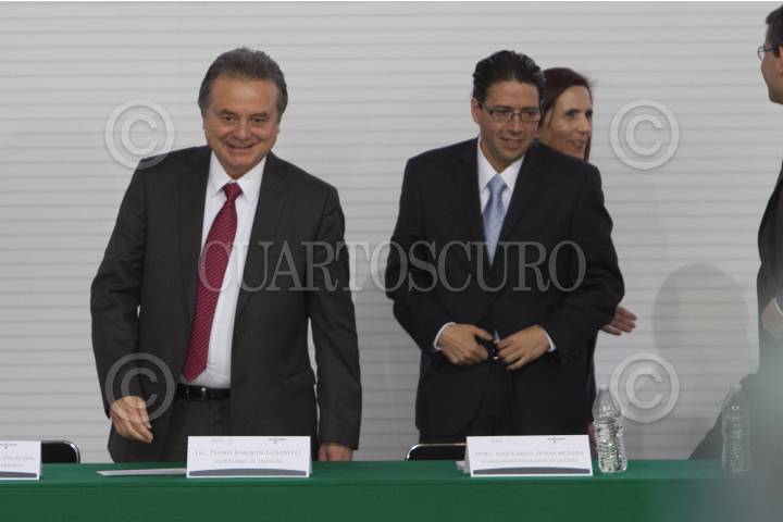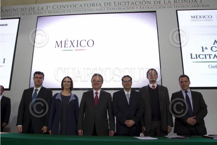 MÉXICO, D.F., 11DICIEMBRE2014.- Pedro Joaquín Codwell, titular de la Secretaria de Energía, encabezo el anuncio de la Primera Convocatoria de Licitación de la Ronda Uno, donde se establecen las base y modelos de contrato para exploración y extracción de Hidrocarburos. Los operadores que participen en la primera convocatoria de licitación de la Ronda Uno estarán obligados a demostrar capacidad técnica y financiera, lo que significará una forma de blindaje para la licitación. Durante la ceremonia de el secretario fue acompañado de Jorge Rogelio Garza y Garza, subsecretario de Industria y Comercio, Lourdes Melgar Palacios, subsecretaria de Hidrocarburos, Juan Carlos Zepeda Molina, Comisiona Presidente de CNH, Miguel Messmacher Linartas, subsecretario de ingresos y Carlos Regules Ruiz Funes, Director General de ASEA. FOTO: GUILLERMO PEREA /CUARTOSCURO.COM
