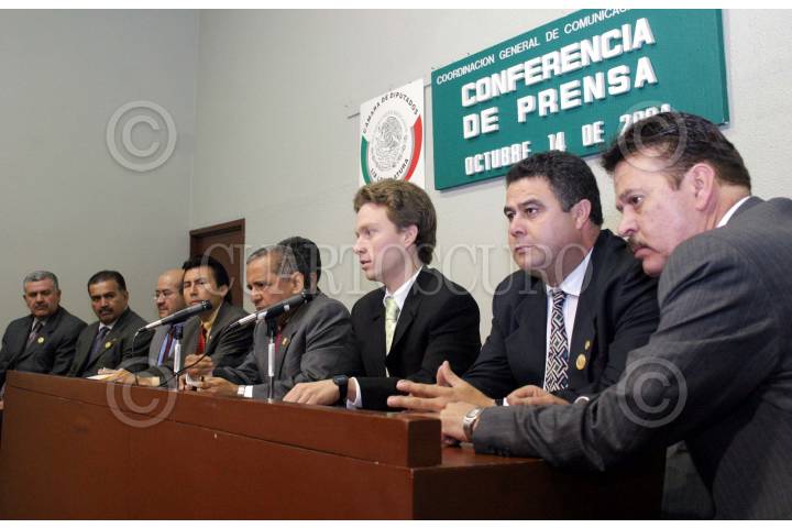 México, D.F., 14OCTUBRE2004.- Jorge Uscanga Escobar, diputado veracruzano del PRI, Manuel Velasco Coello, PMVE y Filemón Aranda Suárez, ofrecieron una conferencia de prensa para hablar sobre las impugnaciones por parte del PAN, en el resultado de las pasadas elecciones a Veracruz. FOTO: Moisés Pablo/CUARTOSCURO.COM