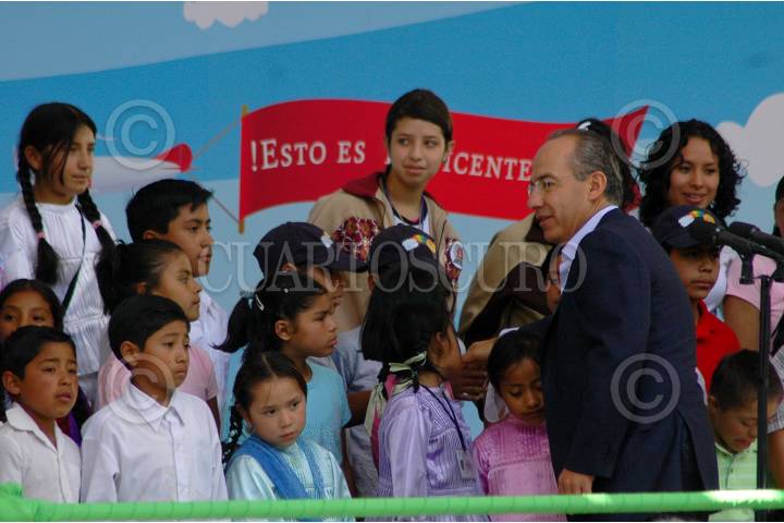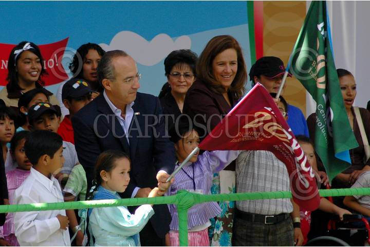 MÉXICO, D.F., 25ABRIL2010.- El presidente Felipe Calderón acompañado de su esposa Margarita Zavala y de sus hijos Maria, Juan Pablo y Luis Felipe durante el banderazo de salida del Desfile Infantil Niños por el Bicentenario que se realizo sobre el Paseo de la Reforma desde el Circuito Gandhi hasta la glorieta de Colon. FOTO: RODOLFO ANGULO/CUARTOSCURO.COM