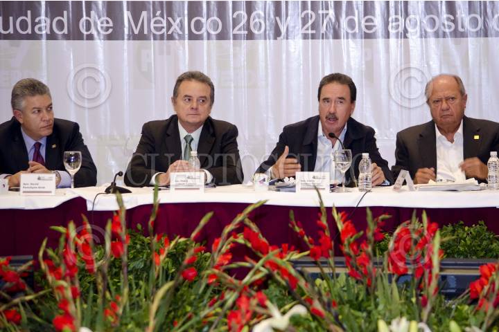 MÉXICO, D.F., 26AGOSTO2013.- David Penchyna, presidente de la Comisión de Energía del Senado de la República; Pedro Joaquín Coldwell, secretario de Energía, Emilio Gamboa, coordinador del grupo parlamentario del PRI en el Senado y Carlos Romero Deschamps, senador y dirigente sindical; durante la III Reunión Plenaria del grupo parlamentario del Partido Revolucionario Institucional (PRI) en el Senado de la República. Ahí habló sobre la Reforma Energética presentada por el Poder Ejecutivo. FOTO: EMILIANO RUVAL / CUARTOSCURO.COM