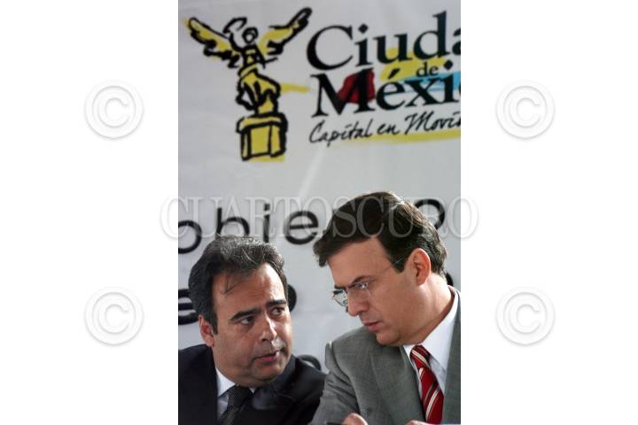 MÉXICO D.F. 09ENERO2007.- Raymundo Collins Flores director general de CEDA y Marcelo Ebrad Casaubón jefe de gobierno capitalino, durante la ceremonia de colocación la colocación de la primera piedra del centro comercial "Plaza Central" que estara ubicada en las inmediaciones de la Central de Abasto. FOTO: GUILLERMO PEREA /CUARTOSCURO.COM