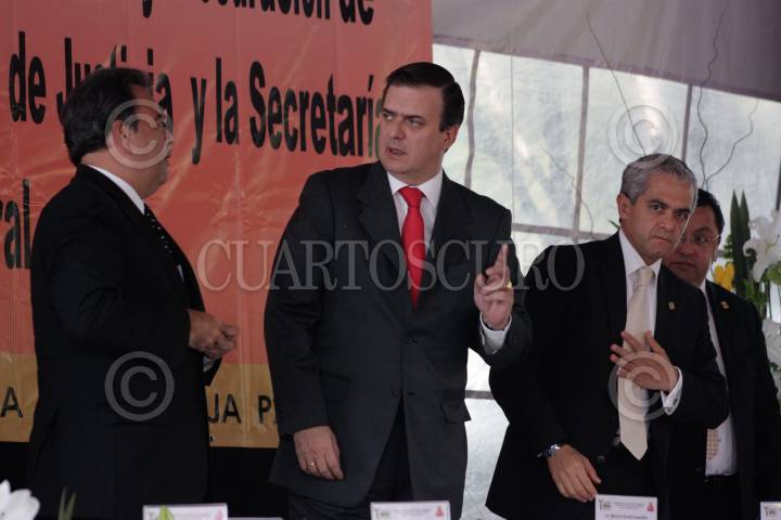 MEXICO, D.F., 19NOVIEMBRE2009.- Raymundo Collins director de la Central de Abastos, Marcelo Ebrard Casaubón, jefe de gobierno y Miguel Ángel Mancera , Procurador de Justicia del D.F durante la certificacion del ISO 9001 en las oficinas administrativas de la Central de Abastos. FOTO: ESSENE HERNÁNDEZ/CUARTOSCURO.COM