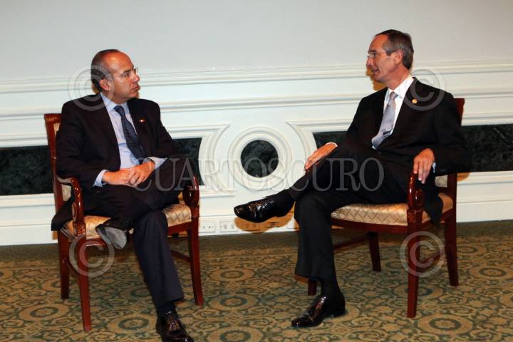 GUATEMALA, GUATEMALA, 22JUNIO2011.- Felipe Calderón Hinojosa, presidente de México, se reunió este día con el presidente de Guatemala, Álvaro Colom Caballero, en el marco de la primera conferencia internacional de apoyo a la estrategia de seguridad de Centro América. Ésto se realizó en el Hotel Westin Camino Real. FOTO: ALFREDO GUERRERO/CUARTOSCURO.COM