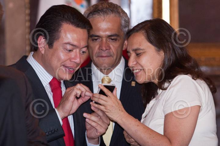 MÉXICO, D.F., 27JULIO2011.- Mario Delgado, secretario de Educación local, el procurador capitalino Miguel Ángel Mancera, y Leticia Bonifaz, consejera Jurídica del Gobierno del Distrito Federal, previo a la ceremonia donde Álvaro Colom Caballeros, presidente de Guatemala, recibió la llave y un pergamino que lo acreditan como Huésped Distinguido de la ciudad de México, en el salón de Cabildos del Antiguo Palacio del Ayuntamiento. FOTO: ISAAC ESQUIVEL/CUARTOSCURO.COM