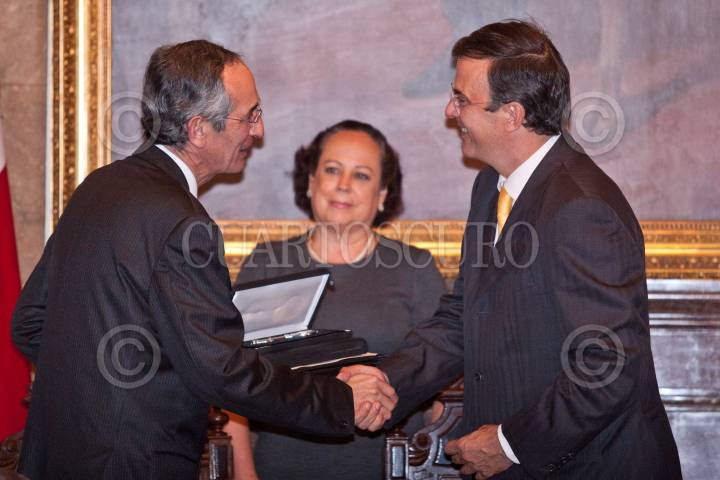 MÉXICO, D.F., 27JULIO2011.- Álvaro Colom Caballeros, presidente de Guatemala, recibió de manos de Marcelo Ebrard Casaubón, jefe de Gobierno del Distrito Federal, la llave y un pergamino que lo acreditan como Huésped Distinguido de la ciudad de México, en el salón de Cabildos del Antiguo Palacio del Ayuntamiento. FOTO: ISAAC ESQUIVEL/CUARTOSCURO.COM