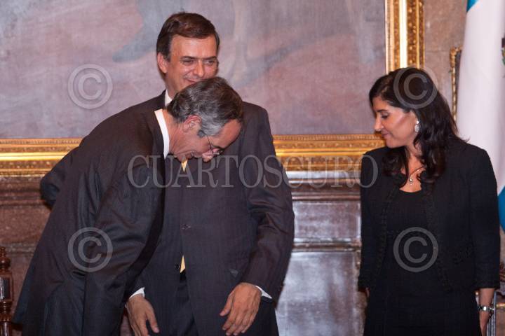 MÉXICO, D.F., 27JULIO2011.- José Antonio Meade Kuribreña, secretario de Energia y Patricia Castellanos, secretaria de Relaciones Exteriores durante un mensaje a los medios de comunicación de parte de los presidente Felipe Calderón, de México y Alvaro Colom, de Guatemala. FOTO: RODOLFO ANGULO/CUARTOSCURO.COM