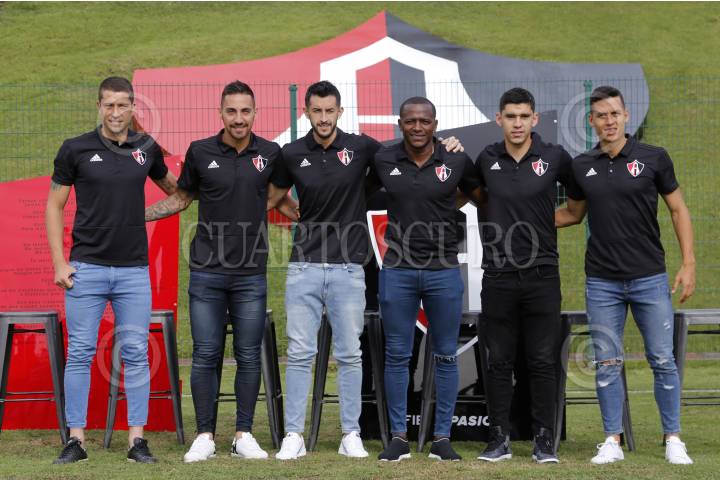 GUADALAJARA, JALISCO, 11JULIO2019.- Esta mañana en las instalaciones del Club Atlas Colomos directivos de la institución realizaron la presentación de los nuevos refuerzos del equipo, entre los que destacan en central argentino Martin Nervo, el delantero argentino Javier Correa, el portero colombiano Camilo Vargas, el lateral colombiano Mauricio Cuero, el lateral mexicano Jesús Angulo y el delantero ecuatoriano Manuel Balda, respectivamente de ( I-D ) en la fotografía general. FOTO: FERNANDO CARRANZA GARCIA / CUARTOSCURO.COM