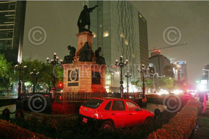 MÉXICO, D.F., 13AGOSTO2010.- Un automóvil Chevy terminó su camino estrellándose con las áreas verdes de la Glorieta de Colón en el Paseo de la Reforma provocado por la falta de pericia del conductor y el piso mojado. FOTO: LUZ ACEVEDO/CUARTOSCURO.COM