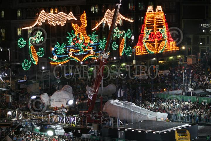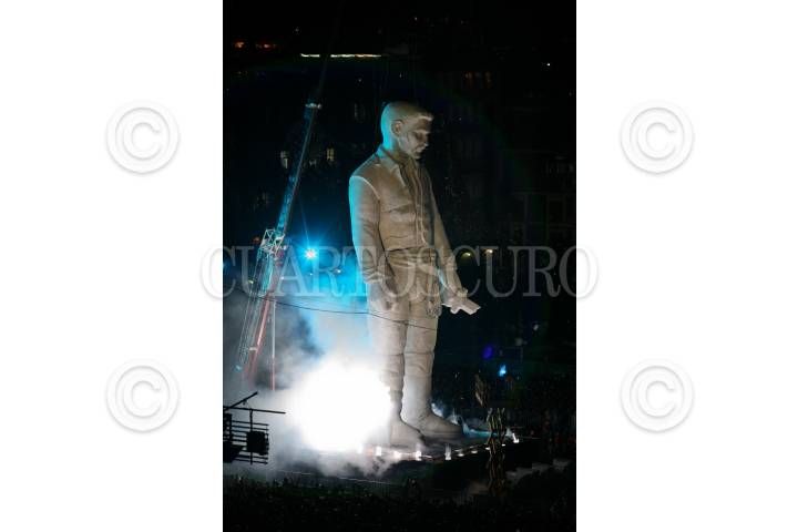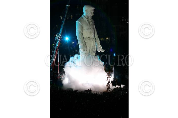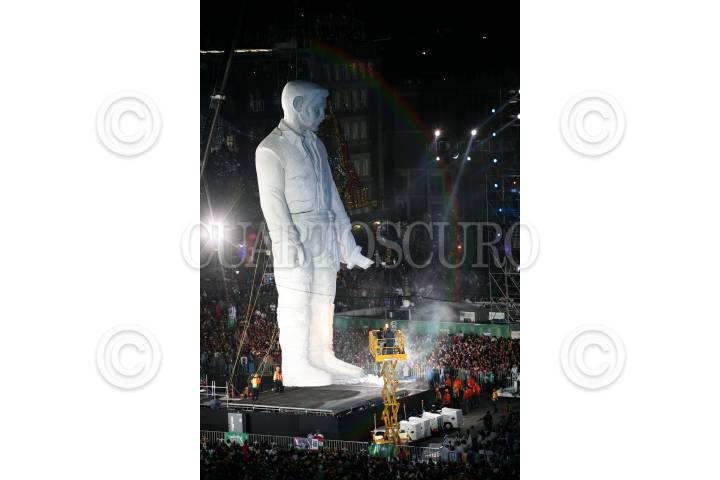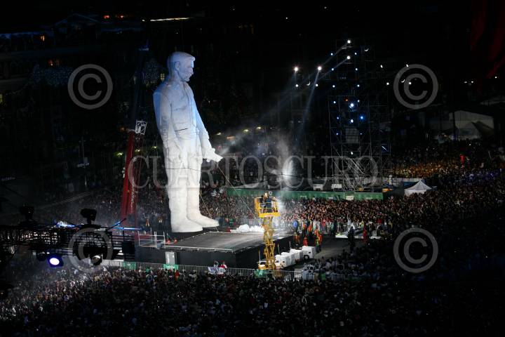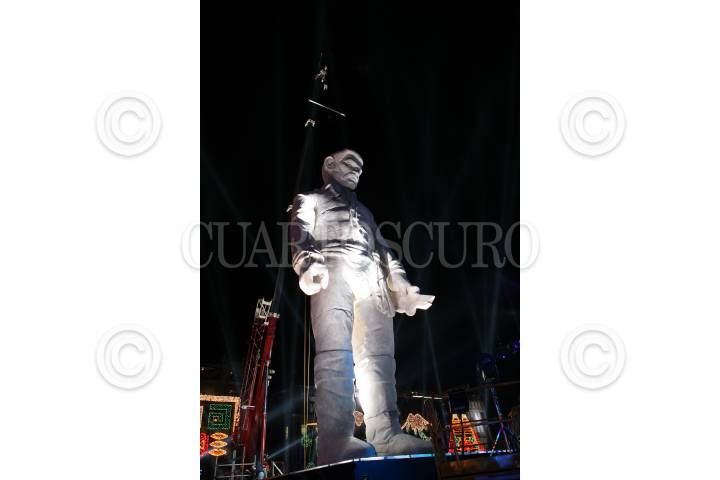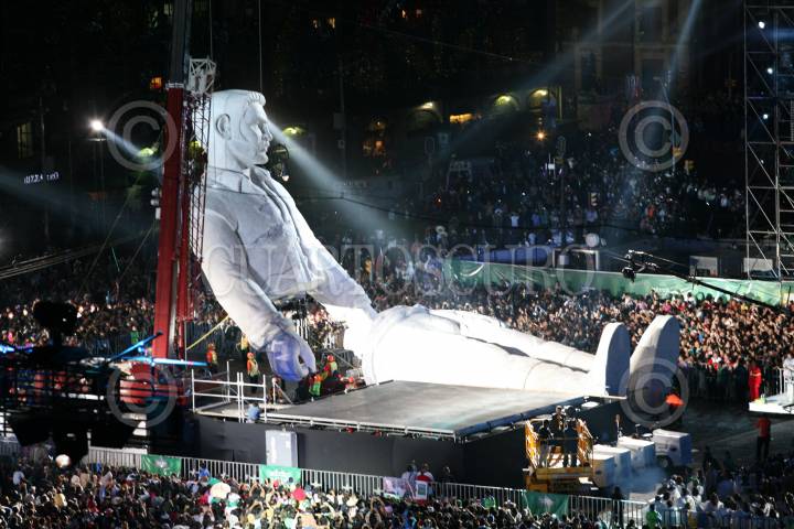 MÉXICO, D.F., 17SEPTIEMBRE2010.- Gran polémica ha causado el "Coloso" que fue exhibido en la plancha del Zócalo durante los festejos del grito de la independencia el pasado 15 de septiembre, esto por qué se ha especulado a quien representó. Según el creador este representa a Benjamín Argumedo, un personaje no tan ilustre de la historia revolucionaria mexicana, sin embrago, la gente hecho a andar su imaginación comparándolo con personajes como: Emiliano Zapata, Jesús Malverde, Vicente Fernández, Jeremías Springfield, Stalin, Vicente Nario, entre otros. Aunque su presencia causo gran expectación entre los espectadores no fue muy claro su significado dentro del espectáculo. La SEP dependencia encargada de los organización de los festejos del Bicentenario no ha precisado cual va ser el futuro de este muñeco colosal. FOTO: ARCHIVO/ROCÍO ORTIZ/CUARTOSCURO.COM