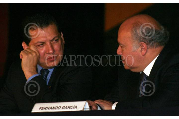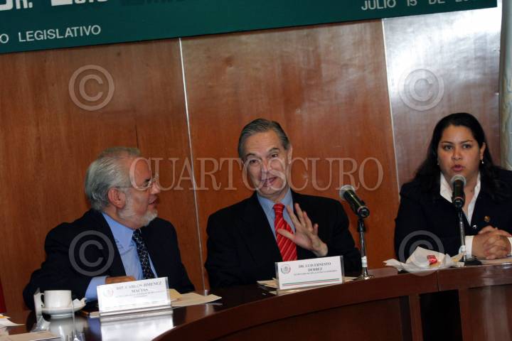 MEXICO, D.F. 15JULIO2005.- Carlos Jiménez Macias, secretario de la comición de relaciones exteriores, Luis Ernesto Derbez Bautista, secretario de relaciones exteriores y Adriana Gonzalez, presidenta de la comición, durante la conferencia de prensa en la camara de diputados. FOTO: Osvaldo Aguilar/CUARTOSCURO.COM