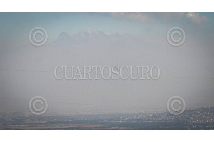 Aspectos del volcán Iztaccíhuatl, rodeado por una masa espesa de contaminación.