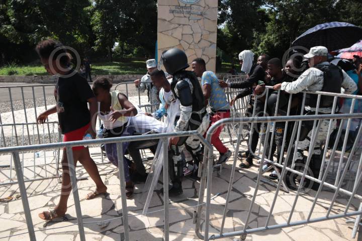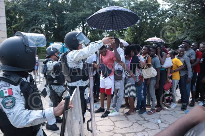 TAPACHULA, CHIAPAS, 18OCTUBRE2023.- La Guardia Nacional intenta ordenar las filas de migrantes desesperados por ser atendidos en las oficinas de Comisión Mexicana de Ayuda a Refugiados (COMAR) y poder conseguir un papel que legalice su estancia en el país y así poder continuar su camino a los Estados Unidos. FOTO: DAMIÁN SÁNCHEZ/CUARTOSCURO.COM