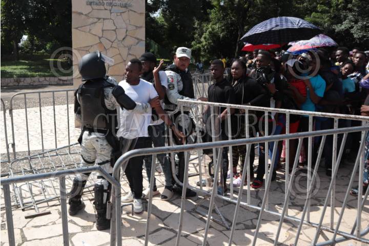 Migrantes de origen haitiano se forman desde muy temprano en las oficinas de la Comisión Mexicana de Ayuda a Refugiados (Comar) para buscar un documento que les valide su estancia legal en el pais y así puedan seguir con un poco más de tranquilidad hacia Estados Unidos, que para muchos es su objetivo. Ante la falta de recursos para conseguir alojamiento se han instalado en campamento en la Plaza Giordano, en la colonia Juárez.