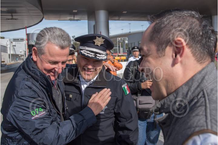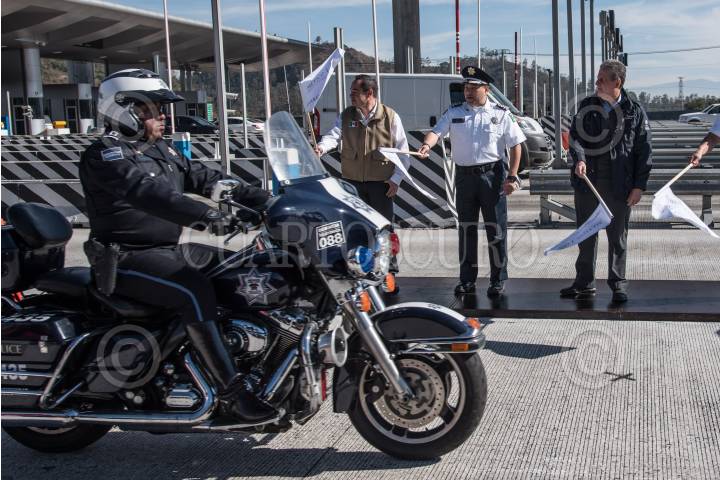CIUDAD DE MÉXICO, 22DICIEMBRE2017.- Manelich Castilla, comisionado de la Policía Federal, Benito Neme Sastré, director general de CAPUFE, y Carlos Bussey Sarmiento, director general de Desarrollo Carretero, encabezaron el banderazo de salida del "Operativo Invierno 2017” en la caseta Tlalpan de la autopista México -Cuernavaca, para garantizar la seguridad en la red de carreteras federales de todo el país, contando con un aproximado de cuatro mil unidades, entre las que destacan ambulancias, motocicletas y radiopatrullas. FOTO: MARIO JASSO /CUARTOSCURO.COM