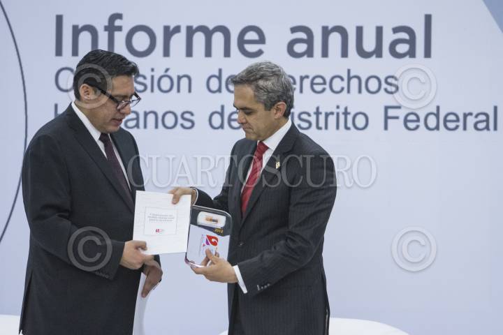MÉXICO, D.F., 24JUNIO2013.- Luis González Placencia, titular de la Comisión de Derechos Humanos del Distrito Federal, presentó el informe anual 2012 dela dependencia. En la imagen, el documento es entregado a Miguel Ángel Mancera, jefe de Gobierno local. FOTO: ISAAC ESQUIVEL /CUARTOSCURO.COM