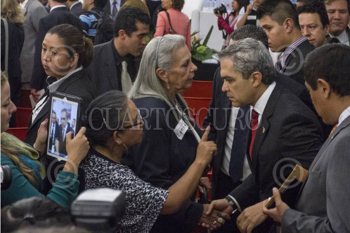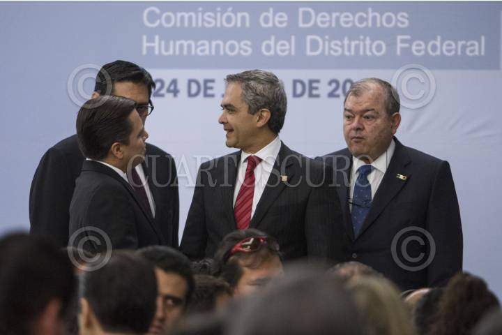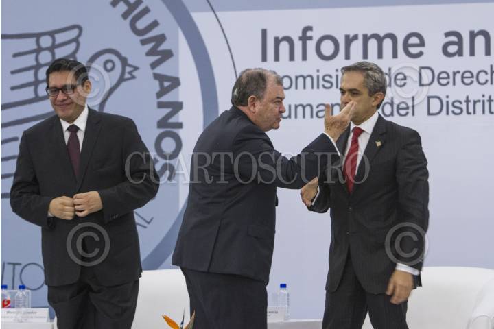 MÉXICO, D.F., 24JUNIO2013.- El asambleísta Manuel Granados, Luis González Placencia, titular de la Comisión de Derechos Humanos del Distrito Federal, Miguel Ángel Mancera, jefe de Gobierno local, y Edgar Elías Azar, presidente del Tribunal Superior de Justicia, durante la presentación del informe anual 2012 dela dependencia. En la imagen, FOTO: ISAAC ESQUIVEL /CUARTOSCURO.COM