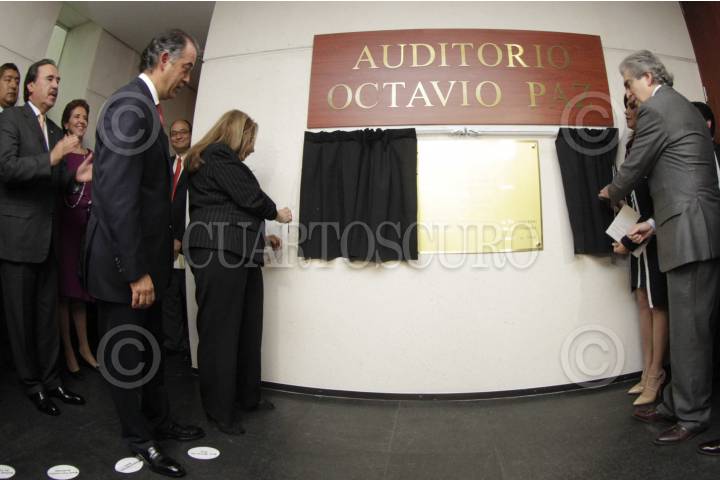 MÉXICO, D.F., 24MARZO2014.- Marie-Jose Tramini, viuda del escritor Octavio Paz, develó una placa conmemorativa en el Senado de la República, en una ceremonia en el marco del 100 aniversario dle natalicio del Nobel de Literatura. FOTO: CUARTOSCURO.COM