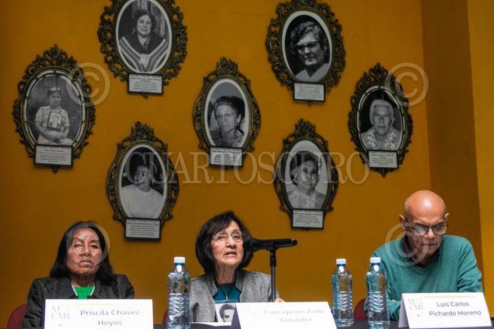 CIUDAD DE MÉXICO, 28AGOSTO2024.- Integrantes del Comité Eureka; Priscila Chávez Hoyos, Concepción Ávila González, Luis Carlos Pichardo Moreno y Rosario Piedra Ibarra, leyeron un comunicado, esto a 46 años de la primera huelga de hambre que encabezó su fundadora Rosario Ibarra de Piedra (1927-2022)- en la Catedral Metropolitana para exigir la aparición de su hijo Jesús Piedra Ibarra y de otros desaparecidos en la llamada Guerra Sucia de los 70s. En la misiva señalaron que el gobierno de Andrés Manuel López Obrador (el cual esta aun mes de concluir) falló en el esclarecimiento de la llamada Guerra Sucia y esperan que la nueva Presidenta Claudia Sheinbaum, quien ha sabe de su lucha, pueda avanzar en el esclarecimiento de estos hechos. Además, recordaron que en vida Rosario Ibarra le devolvió la medalla Belisario Domínguez a López Obrador, con la promesa de que no se la regresará hasta que encontrará a su hijo, sin embargo, no cumplió con esto, por lo que le pidieron a Sheinbaum recuperar esa medalla. FOTO: MOISÉS PABLO/CUARTOSCURO.COM