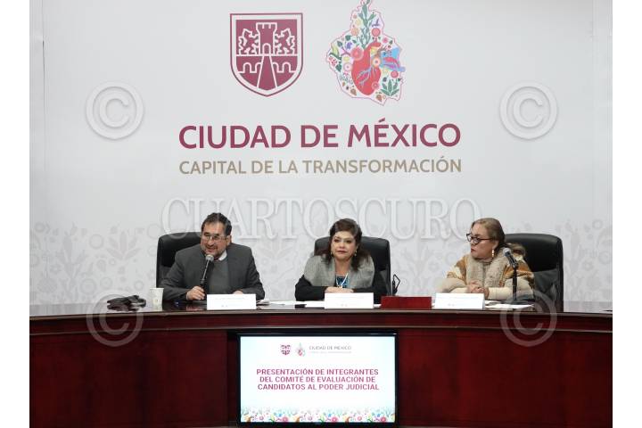 CIUDAD DE MÉXICO, 07ENERO2025.- César Cravioto, secretario de Gobierno; Clara Brugada, jefa de Gobierno, y Eréndira Cruzvillegas Fuentes, Consejera Jurídica y de Servicios Legales de la capital, durante la presentación de integrantes del comité de evaluación de candidatos al Poder judicial realizada en el Antiguo Palacio del Ayuntamiento. FOTO: GRACIELA LÓPEZ/CUARTOSCURO.COM