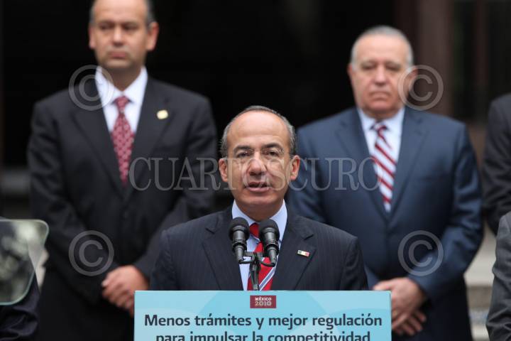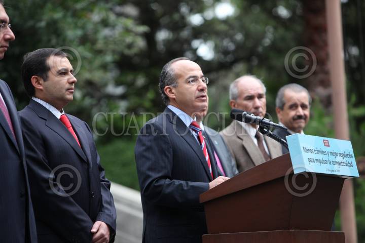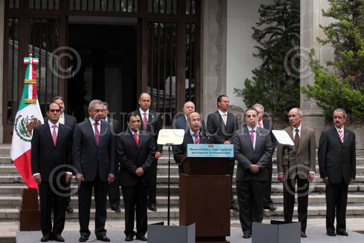 MÉXICO, D.F., 17AGOSTO2010.- Felipe Calderón Hinojosa, Presidente de México, encabezó el arranque del programa "menos trámites y mejor regulación para impulsar la competitividad" en la escalinatas de la cada Miguel Alemán de la residencia oficial de Los Pinos. Lo acompañaron los secretarios de estado; Ernesto Cordero, Secretario de Hacienda, Javier Mayorga Castañeda, Secretaría de Agricultura, Ganadería y José Ángel Cordova Villalobos, Secretaria de Salud. FOTO: ARIEL GUTIÉRREZ/CUARTOSCURO.COM